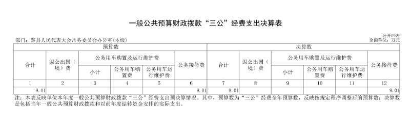 黟县人大常委会办公室2024年度一般公共预算财政拨款“三公”经费支出决算中,因公出国(境)费支出决算0万元;公务接待费支出决算9.01万元,占100%;公务用车购置及运行维护费支出决算0万元。具体情况如下: