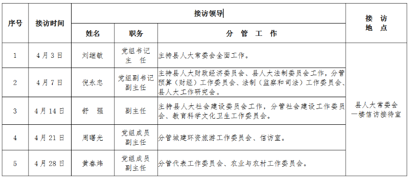 黟县人大常委会领导4月接访安排表